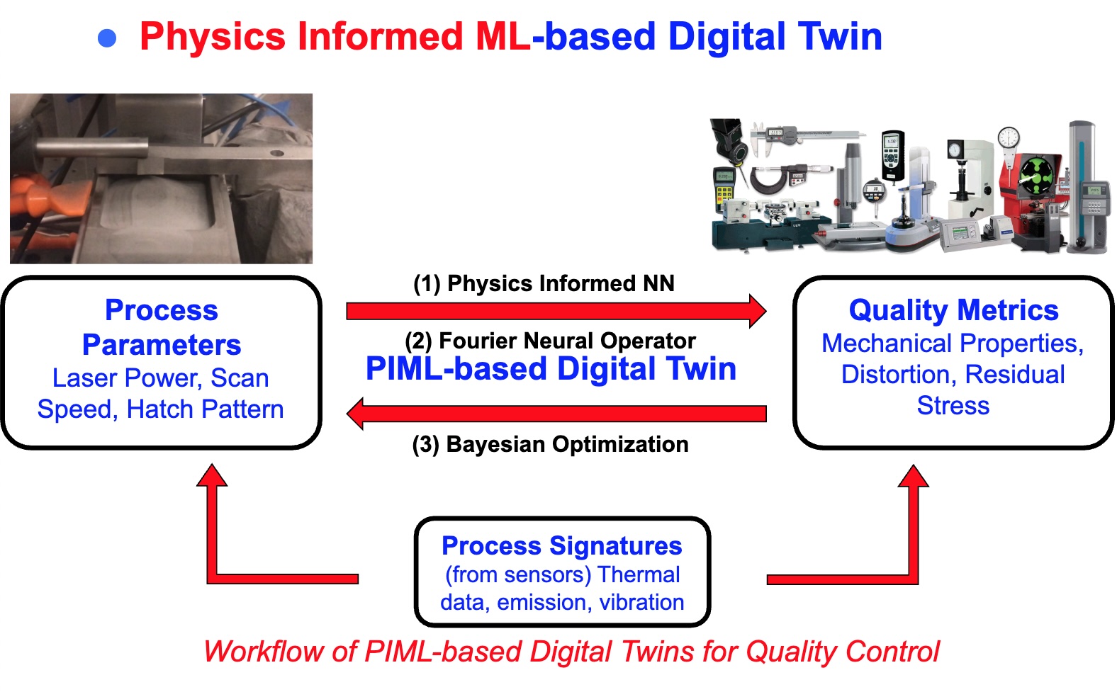 Metal additive manufacturing (AM, or 3D printing) is an emerging technology for producing parts with virtually no constraint on the geometry. AM builds a part by depositing materials in a layer-by-layer fashion. Despite the benefits in several critical applications, quality issues are one of the primary concerns for the widespread adoption of metal AM. This talk will discuss three methods for improving the quality of metal AM processes. (1) Physics Informed Neural Networks (PINNs): Development of a novel activation function and a disjoint architecture enabled fast and accurate physics-based simulations of two metal AM processes - laser powder bed fusion and additive friction stir deposition processes. (2) Fourier Neural Operators (FNOs) are useful in accelerating some of these simulations for a specific type of process optimization. (3) Bayesian Optimization with Deep Gaussian Process for optimizing the process parameters with adaptive experimentation/active learning.